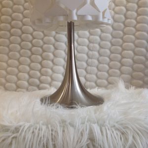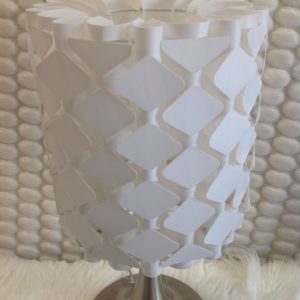 Lámpara de sobremas de original diseño, ideal para espacios minimalistas. Base en acero inoxidable y pantalla en PVC blanco haciendo formas romboidales con perfiles curvos.
