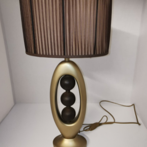 Fabricada en resina, base color oro mate con decoración de bolas color cuero. tulipa de organza color visón.