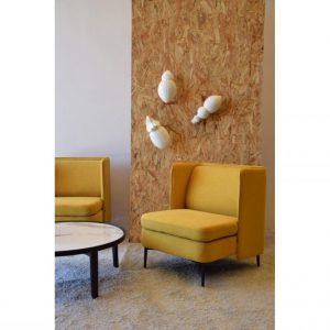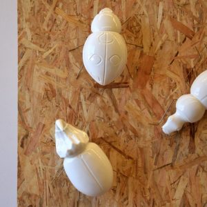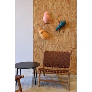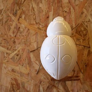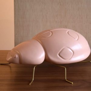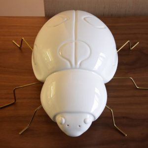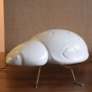 Escultura fabricada en cerámica con patas metálicas en color oro.